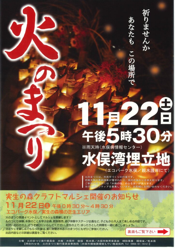 ※雨天時(夜の火のまつりが前日の判断で屋内開催に変更になった場合、荒天時はマルシェは原則として中止、小雨時で開催可能と判断された場合は水俣病情報センター玄関前のピロティにて開催)