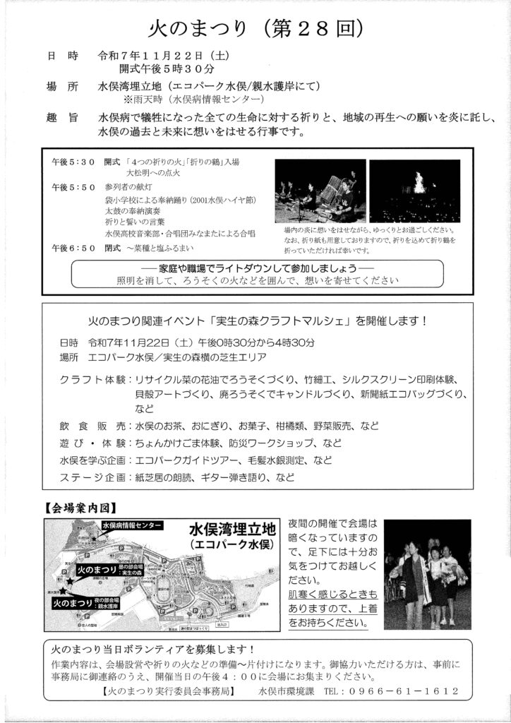火のまつり実行委員会では、水俣病で犠牲となったすべての生命に対する祈りと地域再生の願いを炎に託し、水俣の過去と未来に想いをはせる「火のまつり」を毎年開催しております。